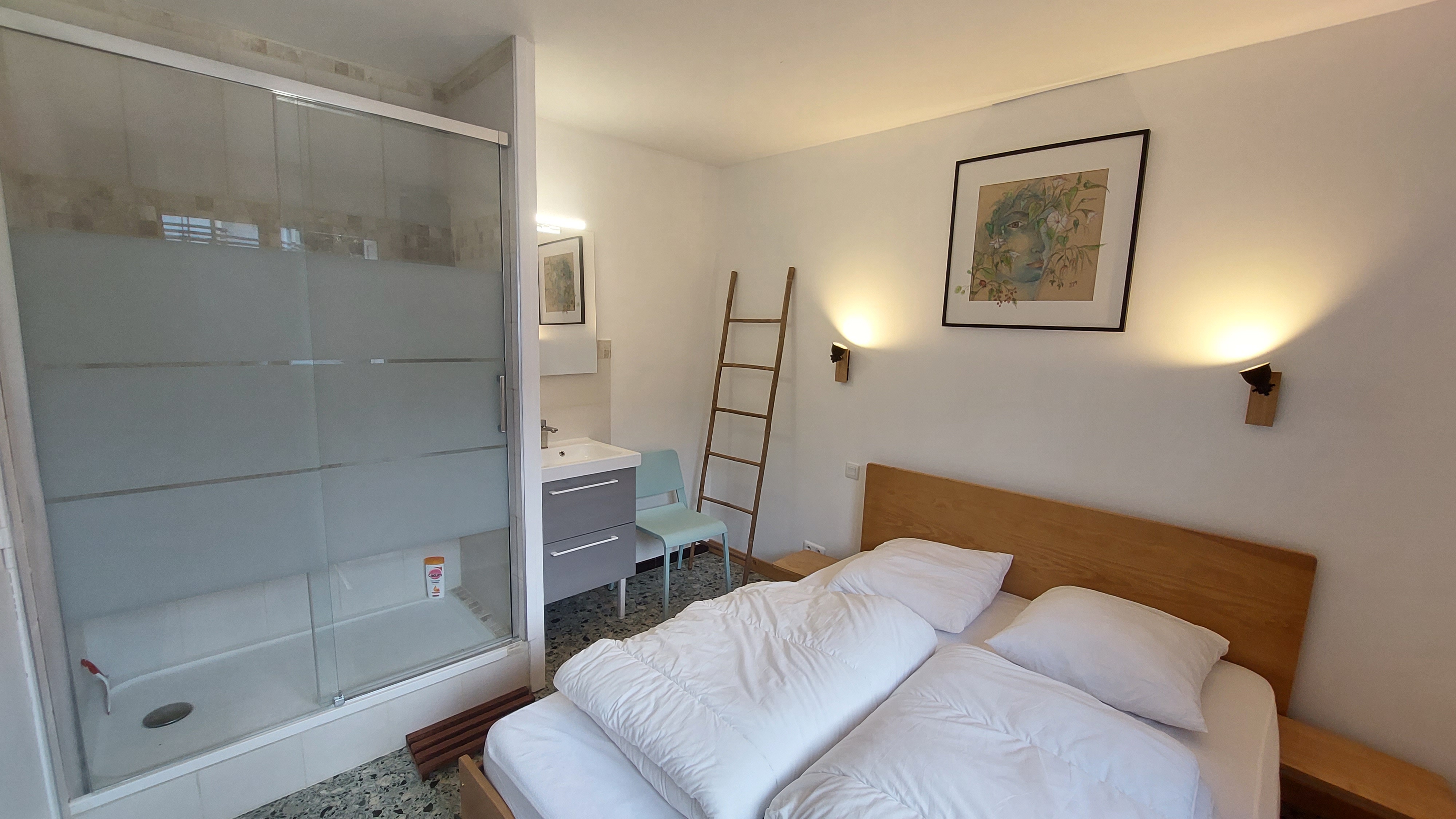 La chambre « Cerf », suite parentale avec un lit double de 160, douche et meuble vasque.